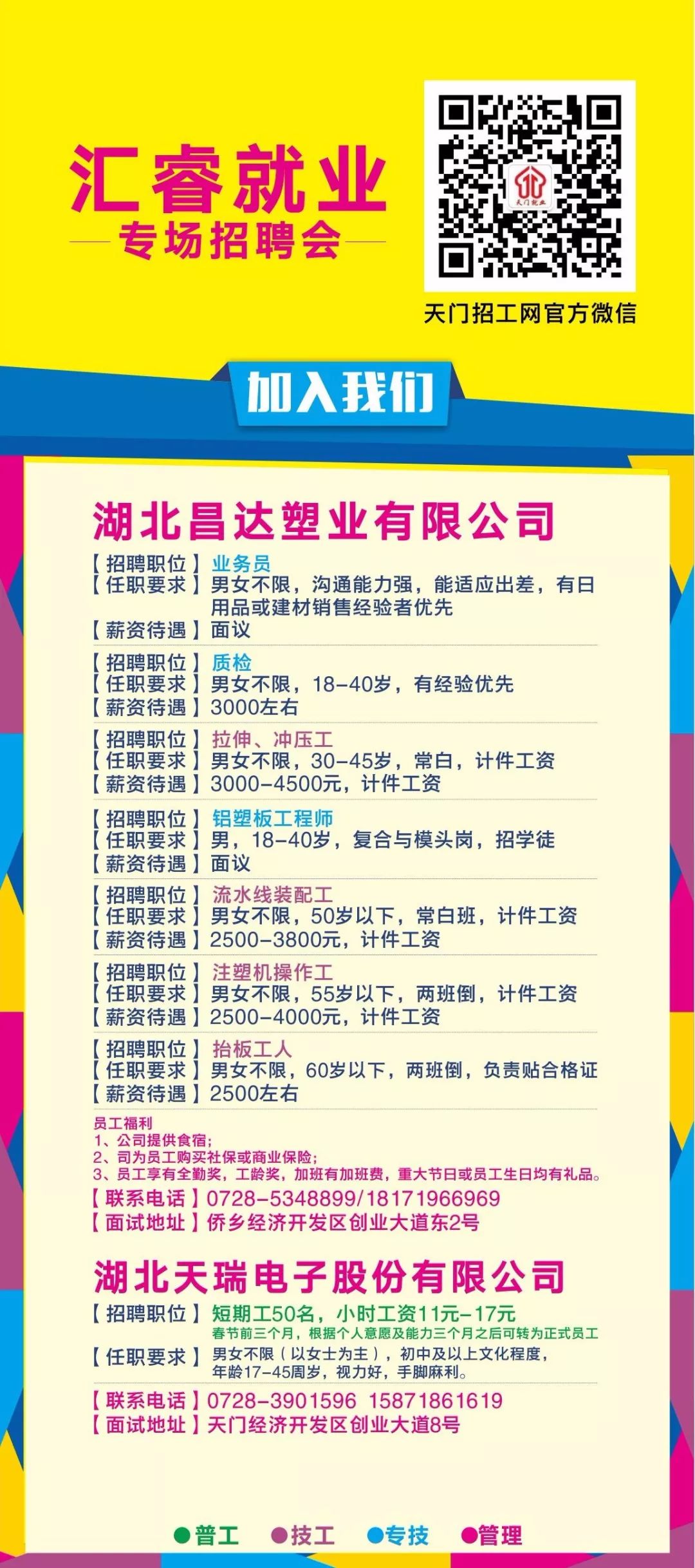 招聘会场热闹非凡,各种招聘信息琳琅满目,小强和小李一边浏览着招聘信息,一边谈笑风生,分享着彼此的想法和趣事,突然,他们眼前一亮,看到了一家公司的招聘信息:“天门最新招聘,寻找有梦想的你们!”
